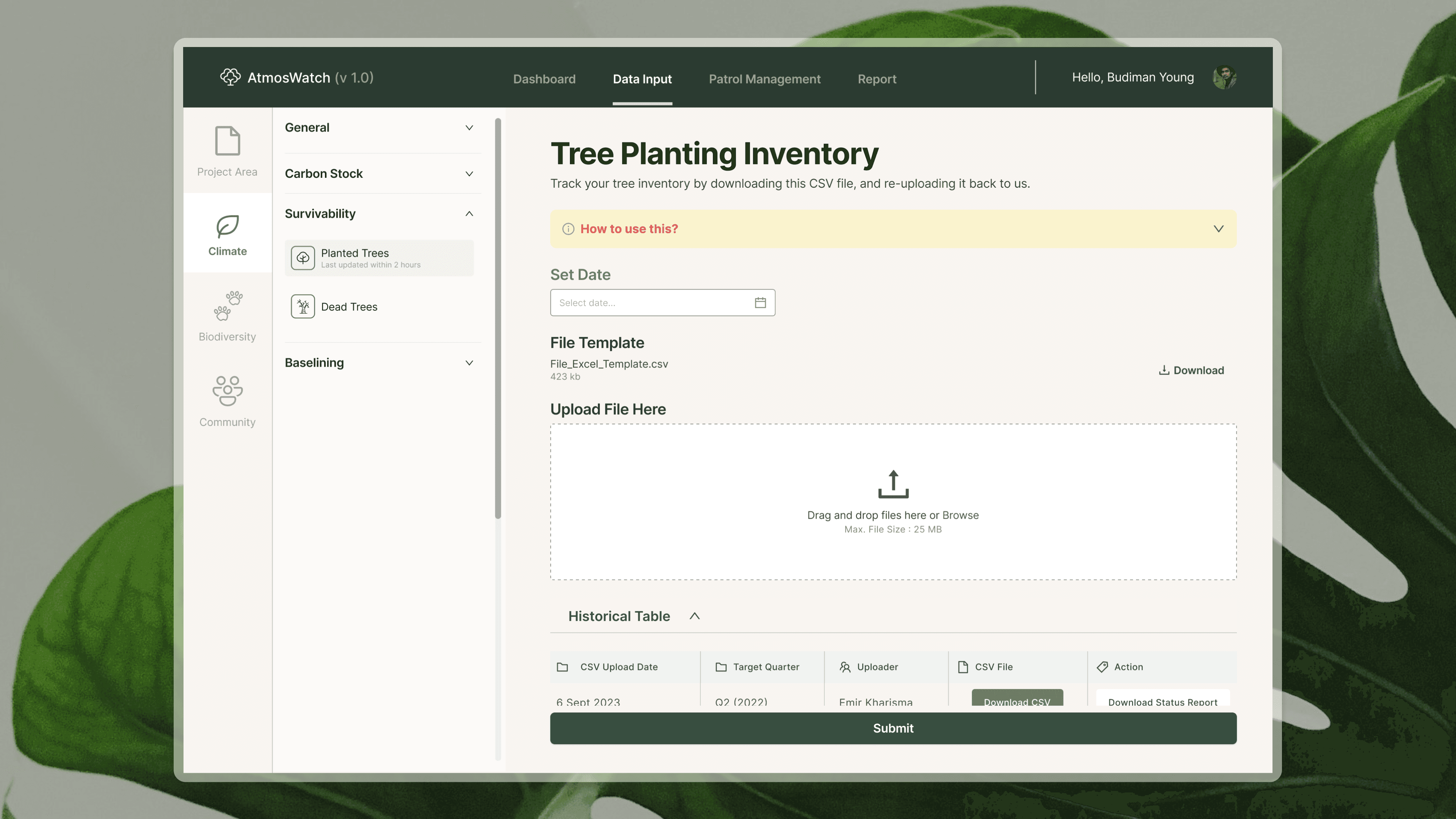 This is where field specialists and project operators fuel AtmosWatch with every crucial datapoint, from tree diameter and soil composition, to wildlife snapshots and community grievances. Our built-in OCR sidekick even turns your trusty pen-and-paper notes into digital, adjustable numbers. Hit upload on the varying items needed, and watch as raw inputs get calculated into tangible numbers, dynamic graphs, and vivid photos on your main dashboard.
