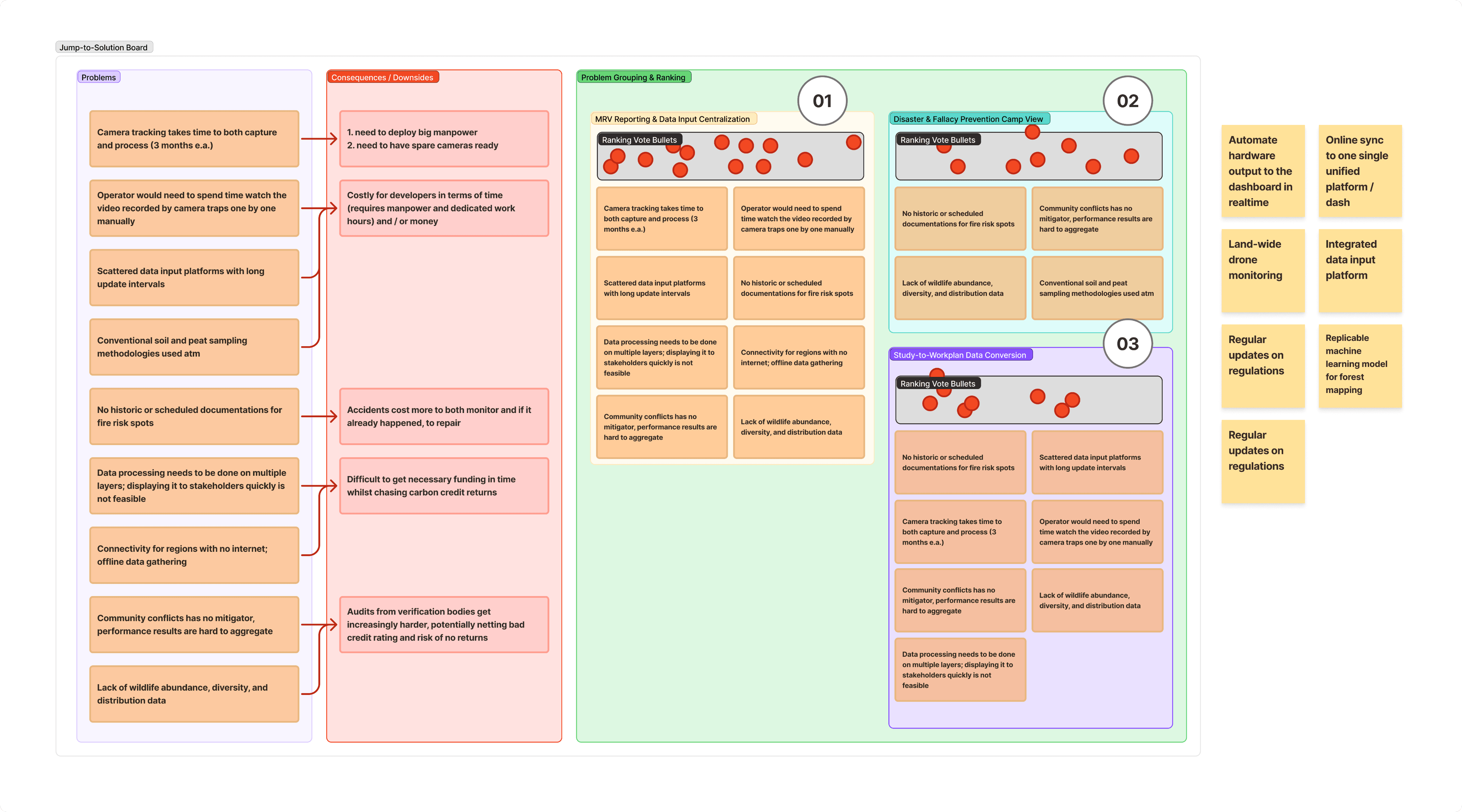 In under two weeks after coming up with a potential problem, we tapped into project owners, remote sensing experts, community managers, and wildlife specialists. Through focus groups and our jump-to-solution board, participants brainstormed, grouped, and ranked features straight from their own field experiences and success stories. From this lively mess, we sharpened hypotheses around the core problems that this project—now aptly named AtmosWatch, must solve.