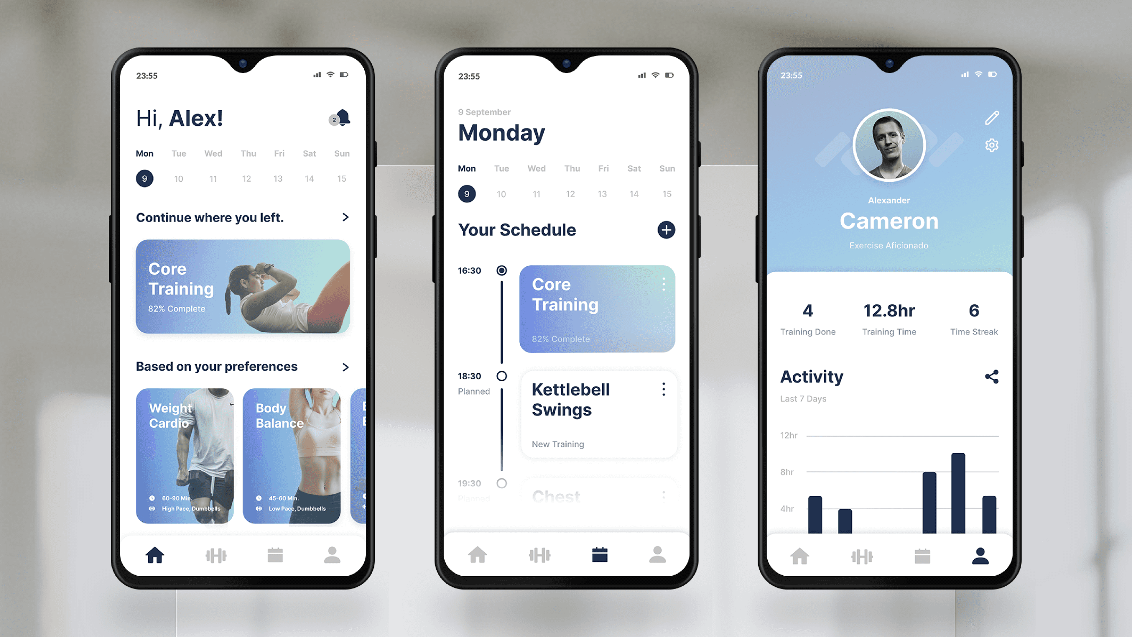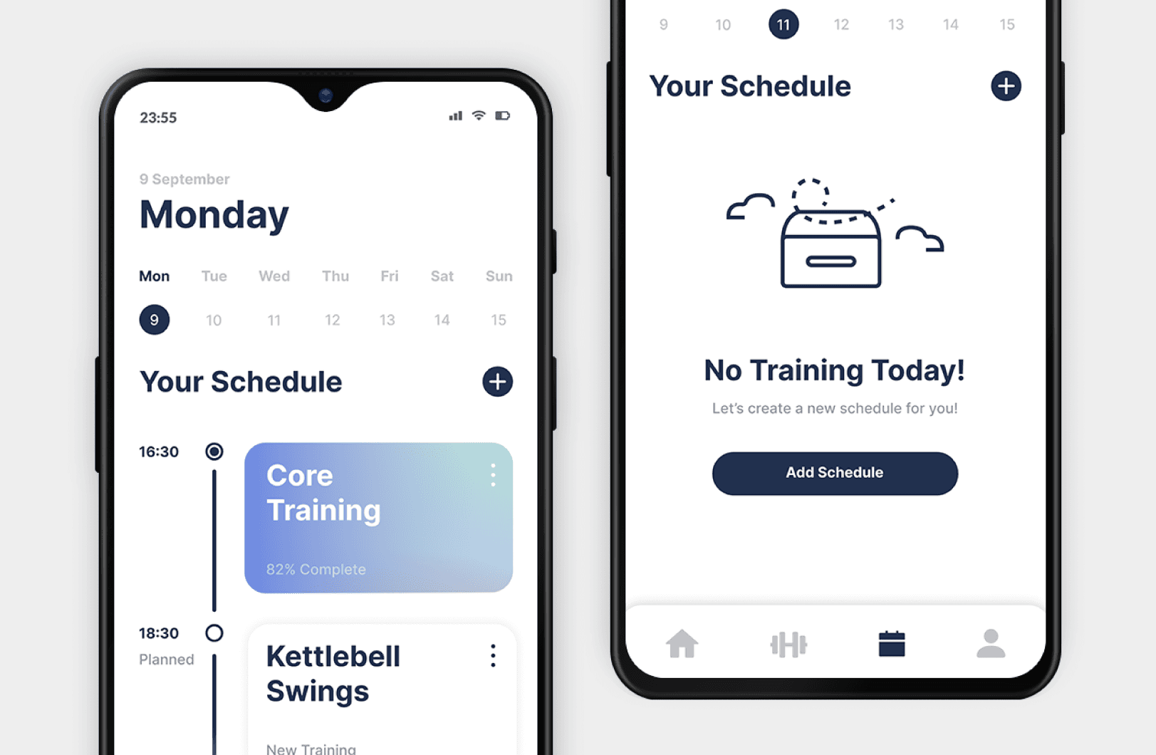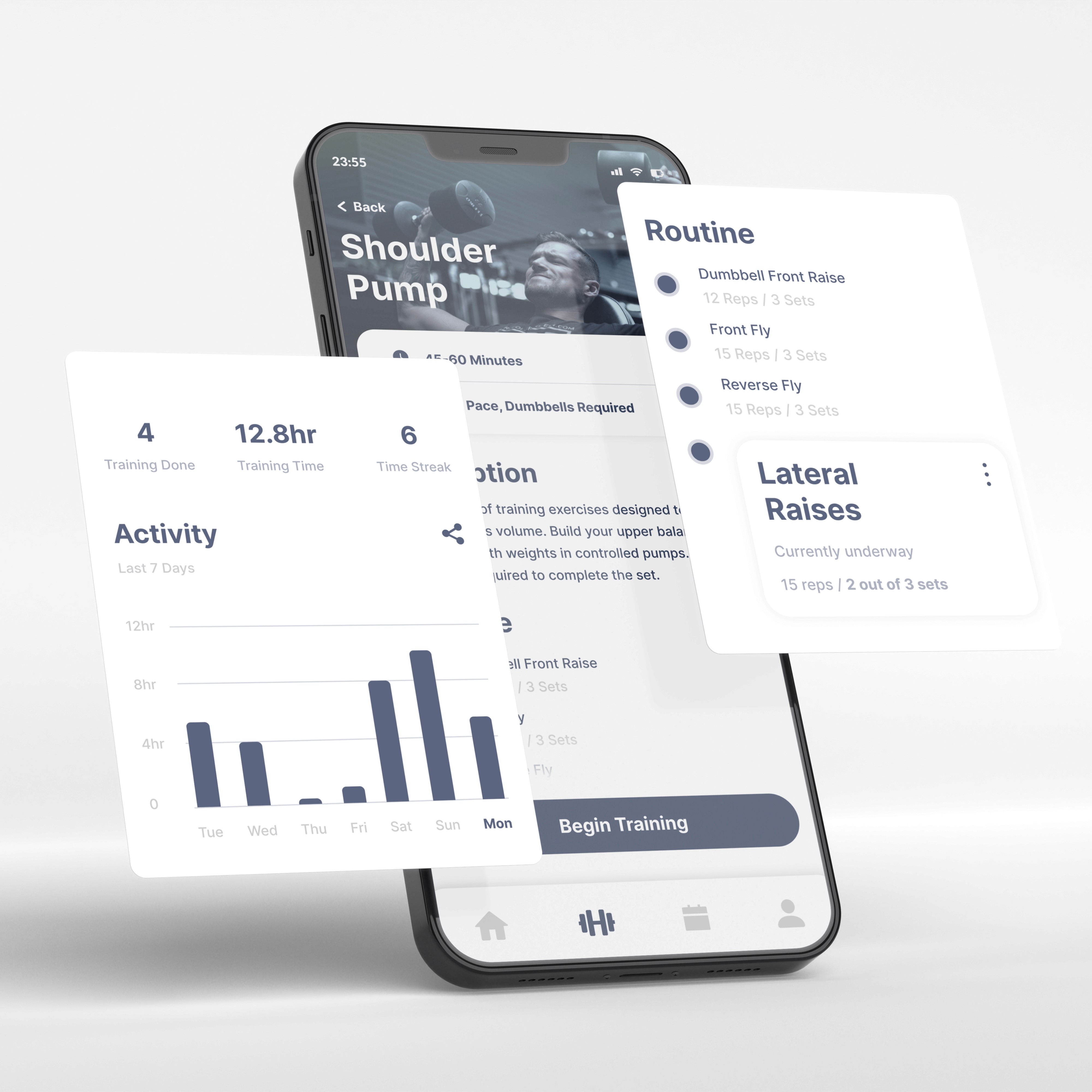 After sorting out the visuals, I created the Main Menu Dashboard so that when you open Fitable, you’re greeted with a clean, card‑based overview of your day’s workout, quick‑stats, and shortcuts, all on one screen. I added a Training Schedule tab where you can drag to rearrange upcoming sessions or tap to swap routines in real time. And because I know how important progress tracking is, so complementing those two is a Profile tab that lays out your consistency streaks, total volume lifted, and personal bests, so you always know exactly where you stand without digging through menus.