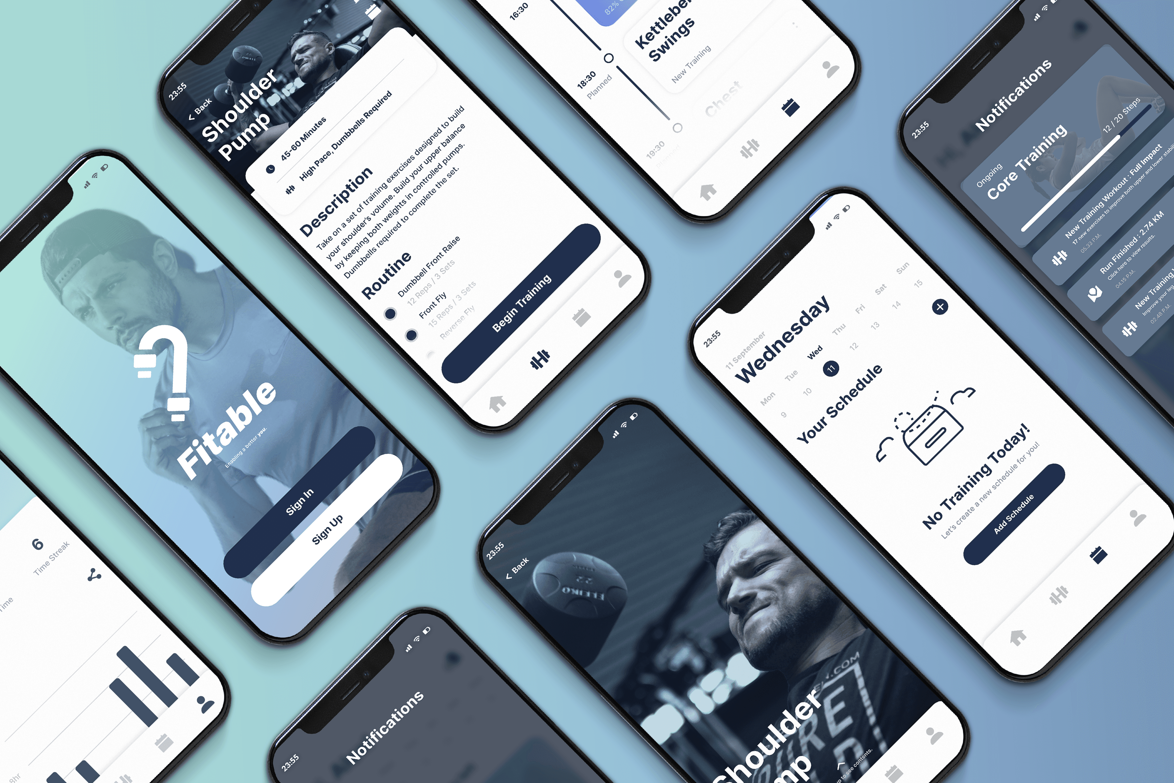 I settled on a cool‑to‑warm gradient, with a dominant navy blue melting into mint green to strike the perfect balance between energy and calm. The navy anchors the interface, lending it a sense of reliability and clarity, while the mint injects a fresh, motivational vibe that nudges you toward your next workout. By using subtle tonal shifts rather than jarring contrasts, Fitable feels both sleek and approachable, guiding users’ eyes through their training data without visual fatigue.