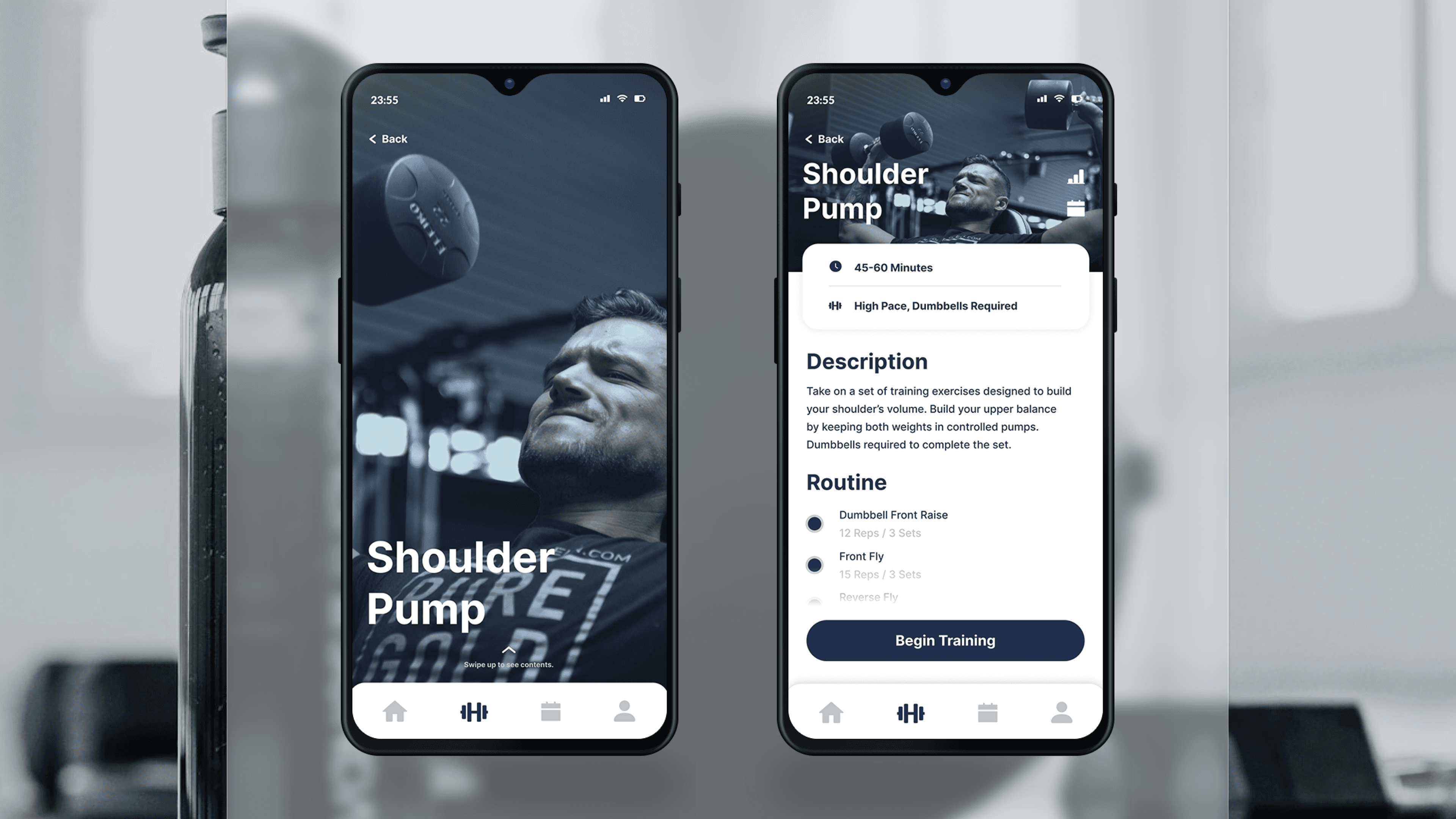 Any of the main menu exercise cards can be expanded to a Routine View. Each routine appears as a sequence of individual exercises, so users can immediately know what they're training. Every time a user begins a training routine, a Step‑by‑Step Guide will be present to highlight each exercise in order and providing inline instructions, demo GIFs, and recommended tempo.