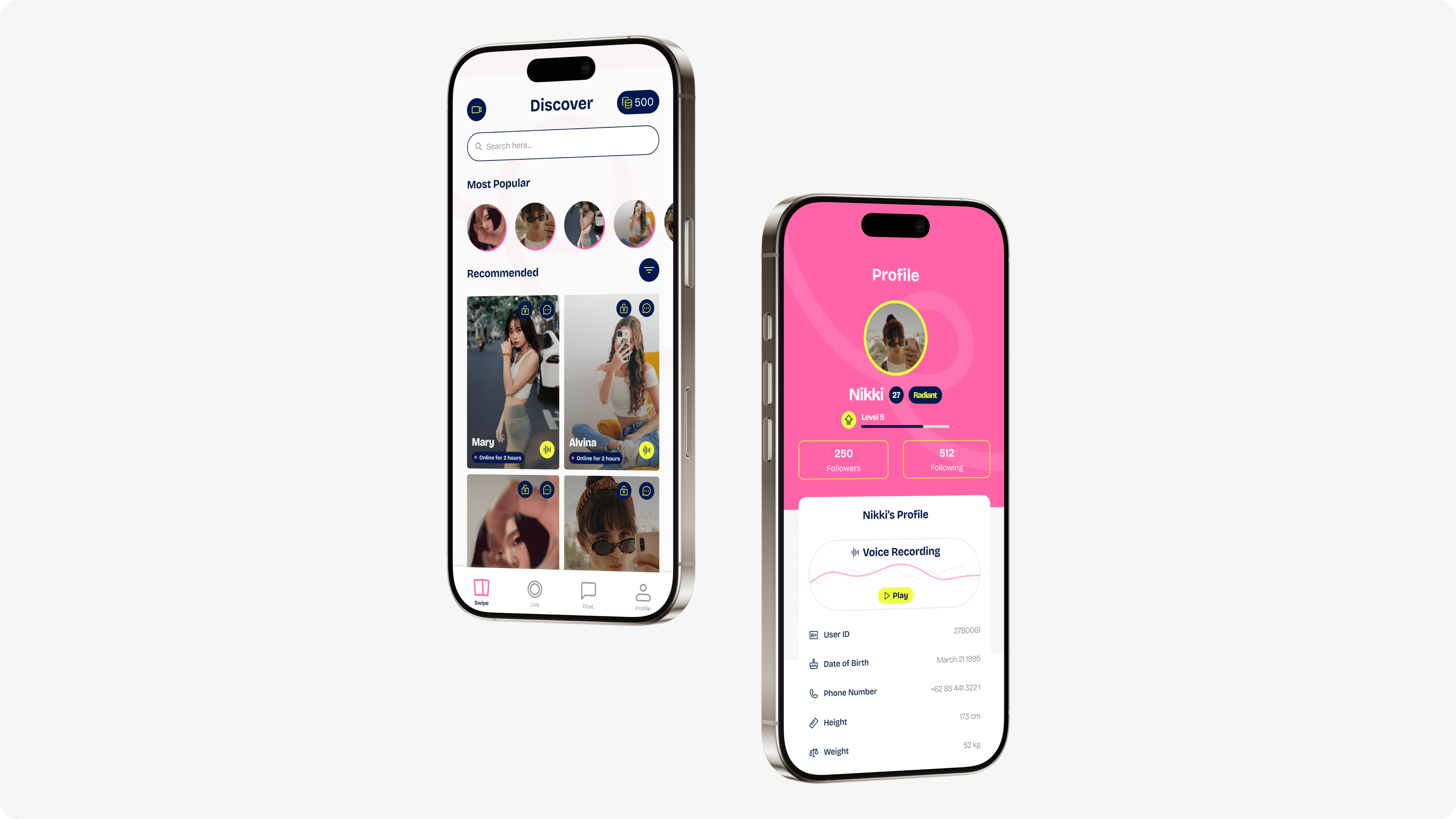 Profiles are also unique as they adapt to the way you plan to use the app. If you’re all about creating content and streaming, you’ll see voice-preview snippets and real-time stream stats front and center. If you’re here to find connections, your own preferences and match data take the spotlight. These were all asked as questions based on your answers during the KYC process before. Both also presents a gamification via one leveling system that tracks your activity and unlocks perks progressively the more you use the app.