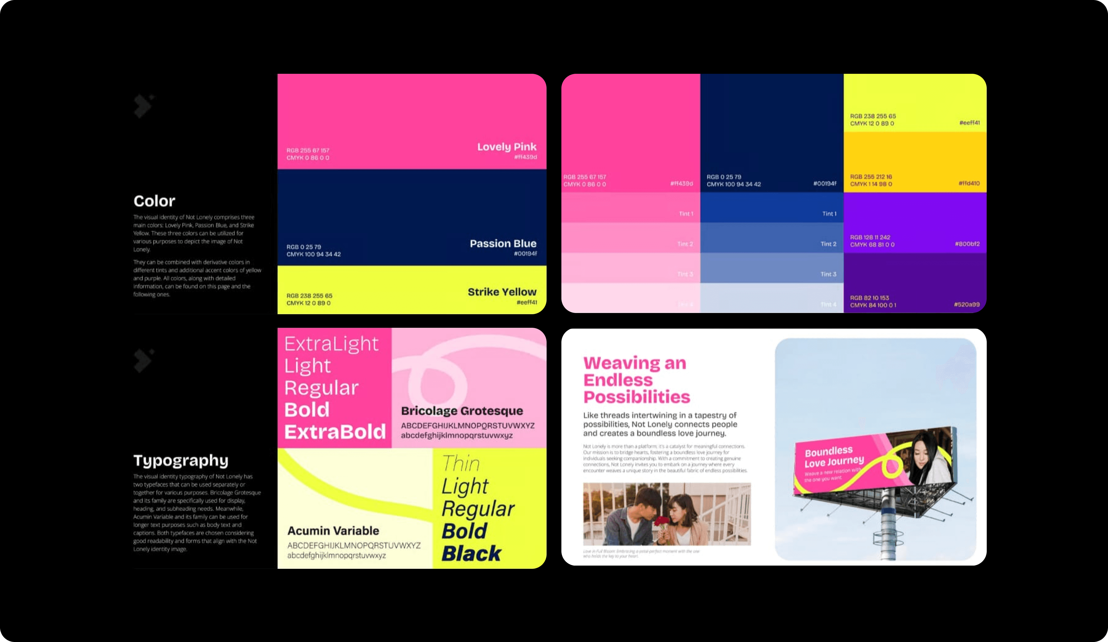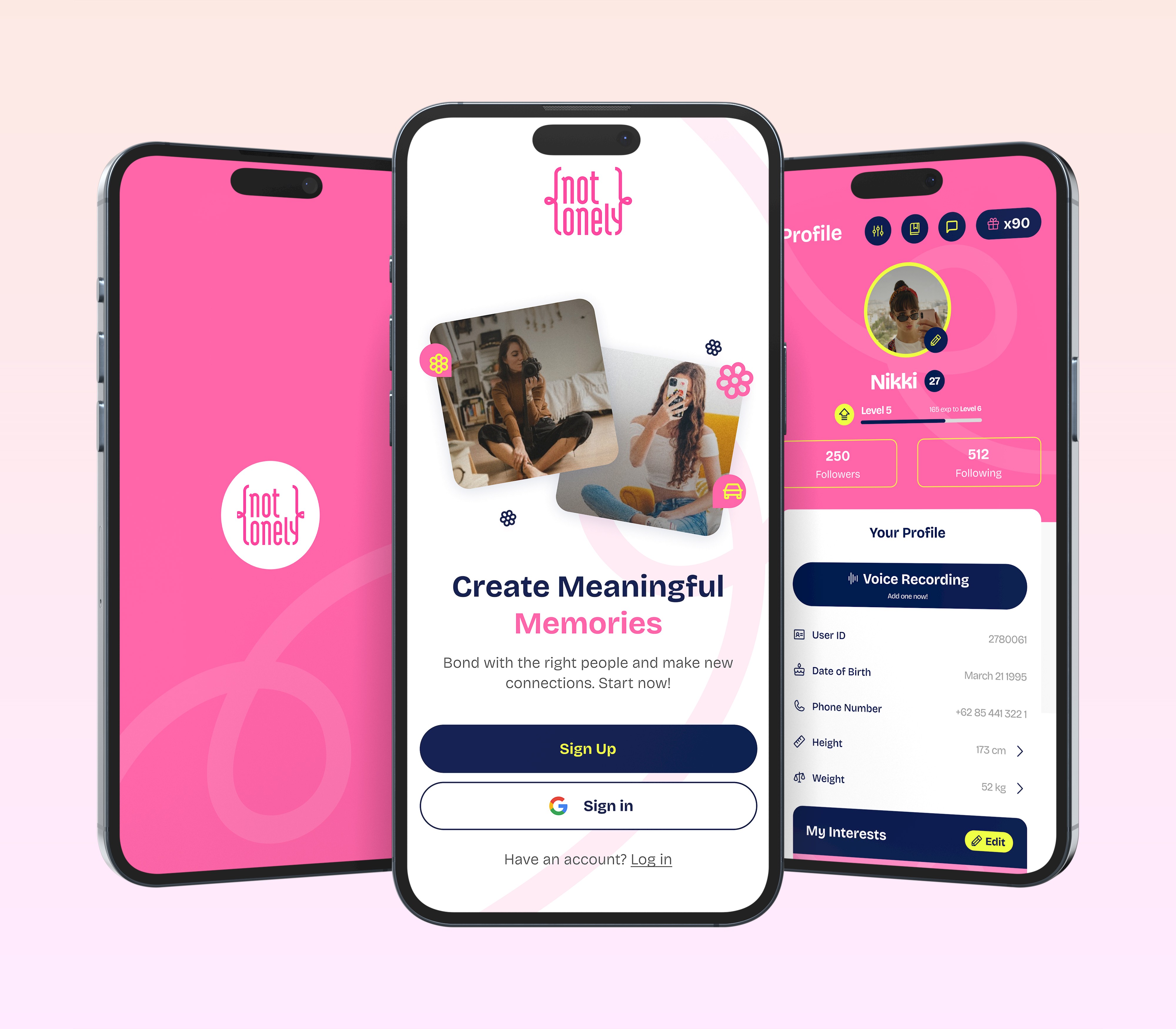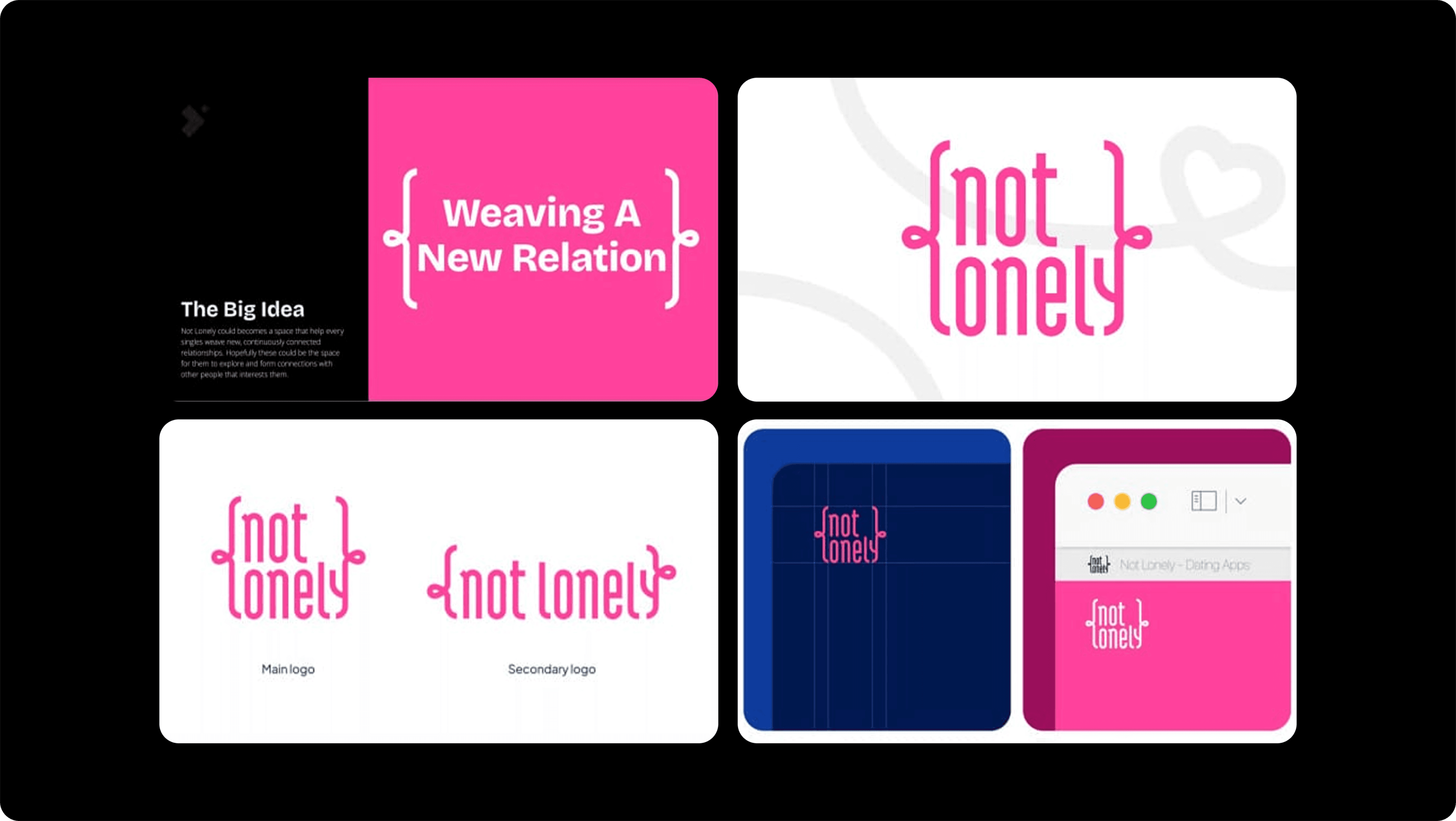 The main theme here is genuine boldness. I want to make sure that Not Lonely, as an app that provides genuine connections, can reflect that in its branding as well. And so, me and the team focused on making the overall concept quite playful in nature, but still grounded enough to be used comfortably on a day-to-day basis. We used colors that pop and shine with a 60-30-10 rule for balance, as well as a ribbon and string-like theming to represent the relationships that we want to create.